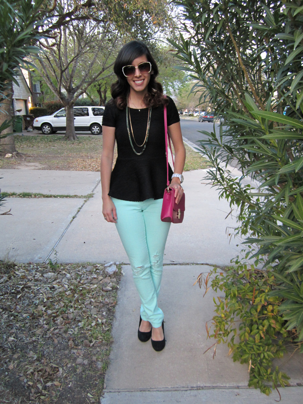 Not much to say about this outfit except its great for a casual Friday at work or going to brunch with your girlfriends. The sleeveless button up shirt and hot pink purse are from Marshalls. My blue suede shoes were purchased from ShoeMint. The bangle set is from Payless.