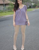 Purple Dress: Elan. Green Leather Jacket: Nikibiki. Sunglasses: Bulgari. Gold Shoes: Shoemint. Gold Clutch: Plato’s Closet.