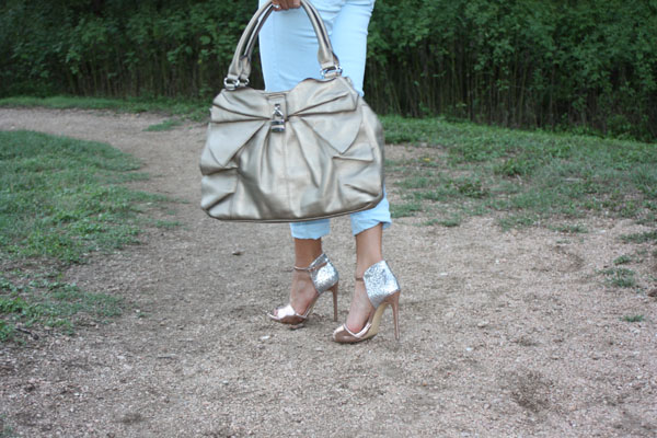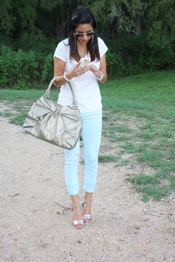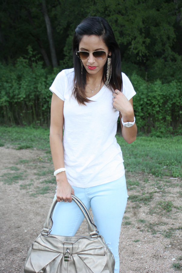 Even in a white tee you can look dressed up with the right accessories! My white cotton tee is from Old Navy and I paired it with these baby blue skinnies from JcPenny. My gold heels from ShoeMint and chandelier gold earrings added a flashy touch. This outfit wouldn’t be complete without this metallic bag from Charming Charlie.