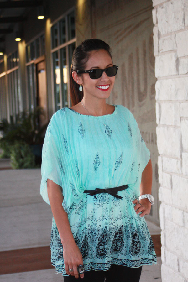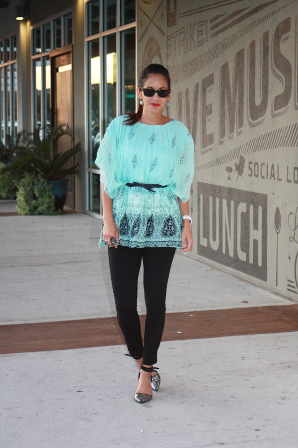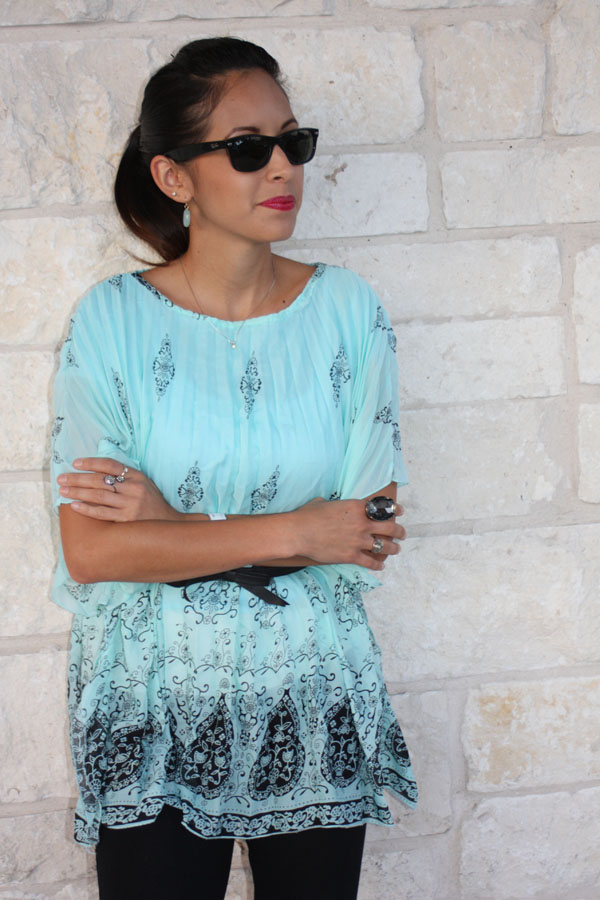 This is one my favorite blouses. I love the turquoise color and the way it flows. I found this gem at Hannah D’s and I paired it with these black skinnies from Marshalls. My metallic ankle strap heals are another favorite of mine from Zara. My matching turquoise earrings are also from Hannah D’s and my sunnies are Ray-Ban.