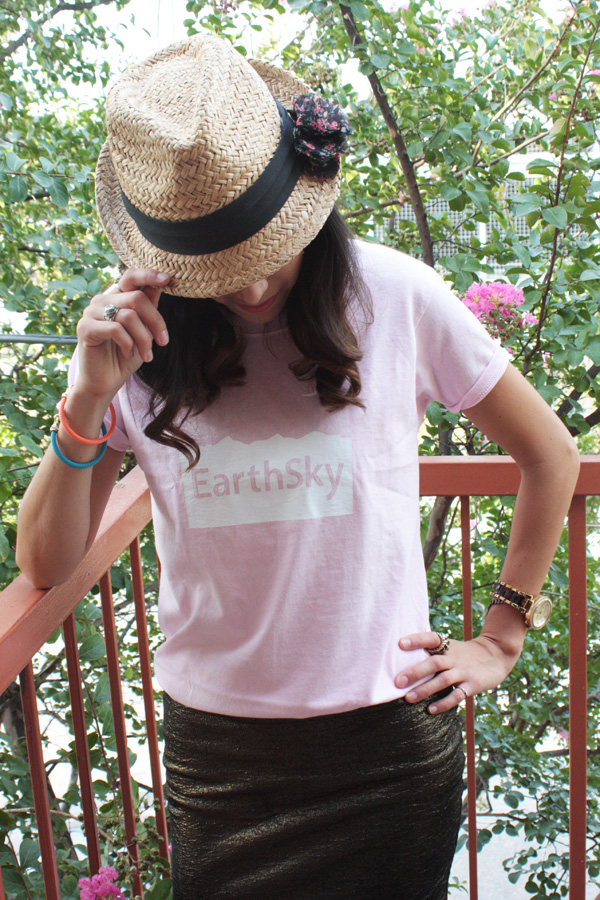You can’t call yourself a true nerd unless you love EarthSky.org!! In an effort to support this awesome science website I purchased one of their t-shirts from EarthSky.org. I paired it with my gold and black skirt from Forever 21 and used these lace up black kicks from A’gaci to keep the look casual. Of course I love the lace detail. To add a little spunk I threw on this hat from Aldo.