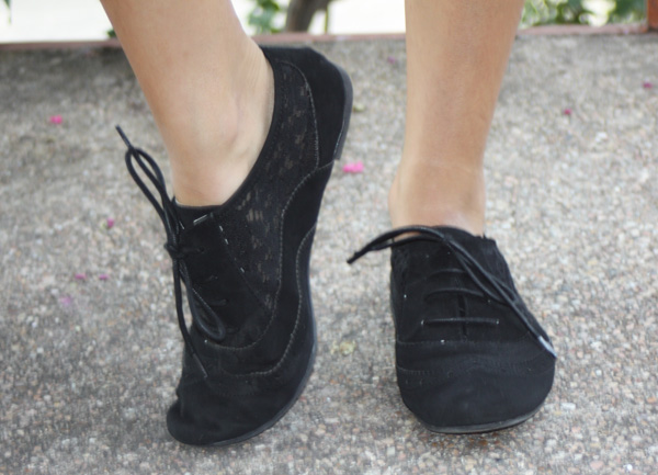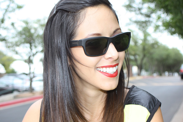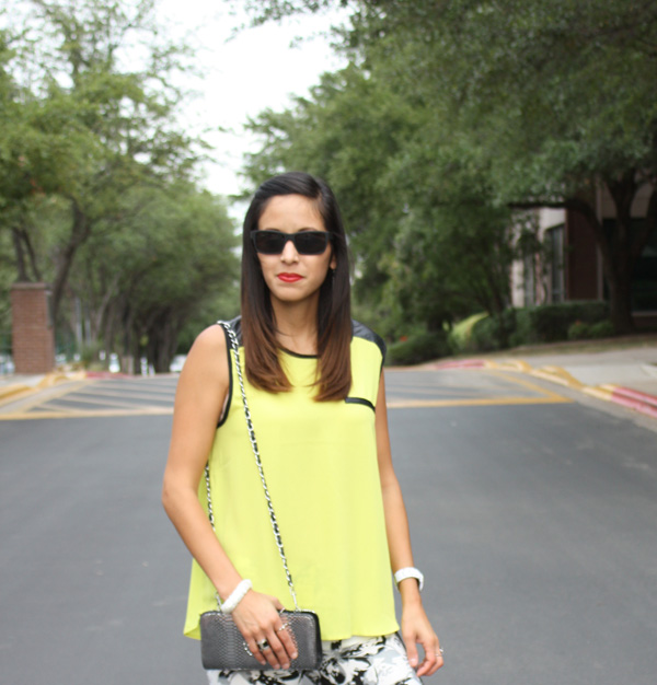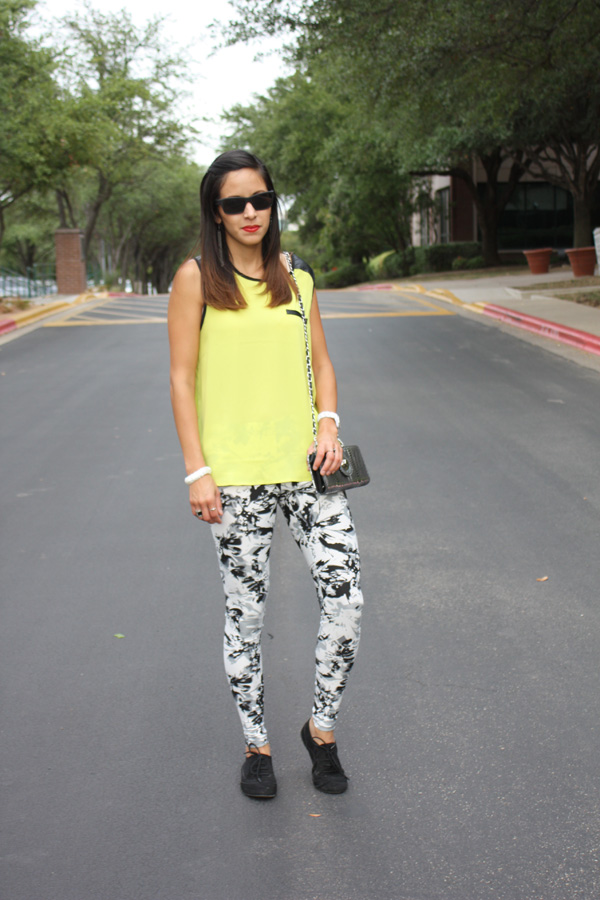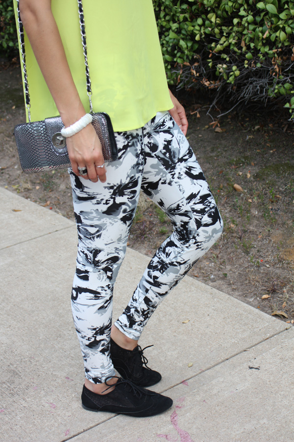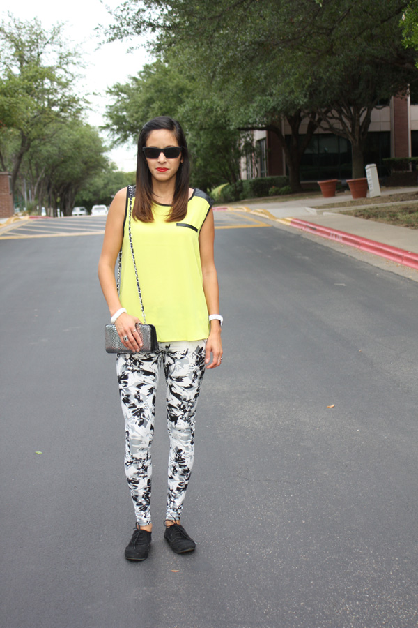 This is my experiment with printed leggings …. definitely a little more funky than my usual style, but what fun is fashion if your not willing to venture out of your comfort zone. These fun black and white leggings were purchased at Marshalls. I chose to pair the leggings with a solid lime green blouse with leather details, also from Marshalls. Agaci has these black oxfords available right now which were perfect to keep this outfit quirky. My silver metallic chain strapped clutch that I used to complete this outfit is from Charming Charlie. My matte finished sunnies were a gift from my sweet boyfriend. He picked them out at South Austin Marine.