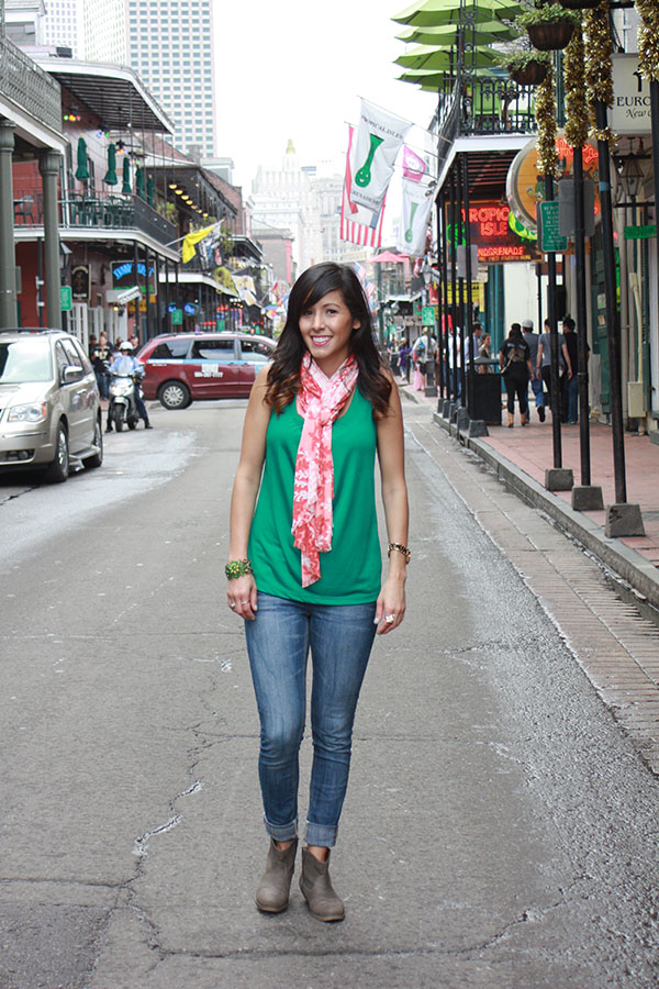 Day two in New Orleans was a little more chill as we were exhausted from the previous day. We did a lot of watching football and eating good food. My emerald green tank top is from Banana Republic and my jeans are from Target. I purchased these brown booties at Ross. The scarf and elephant ring are from Charming Charlie. The emerald green bracelet is something I purchased in China Town while visiting New York a couple of years ago.