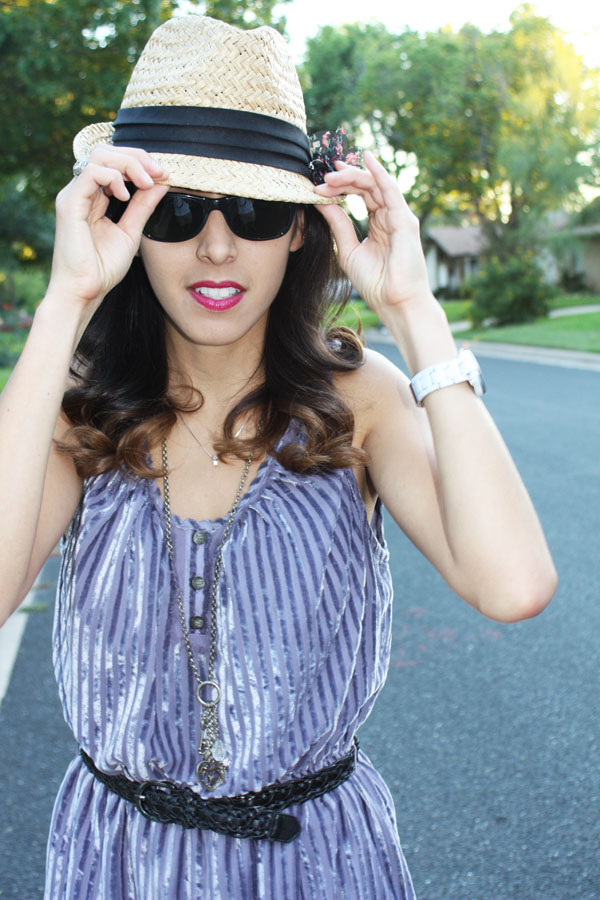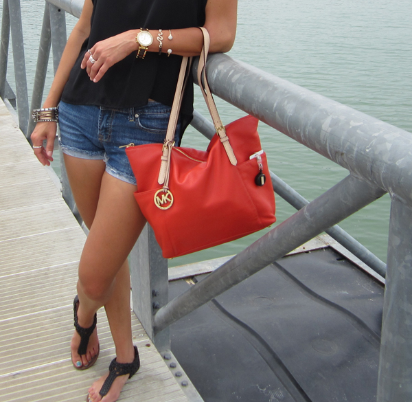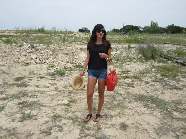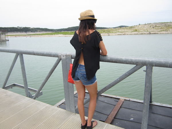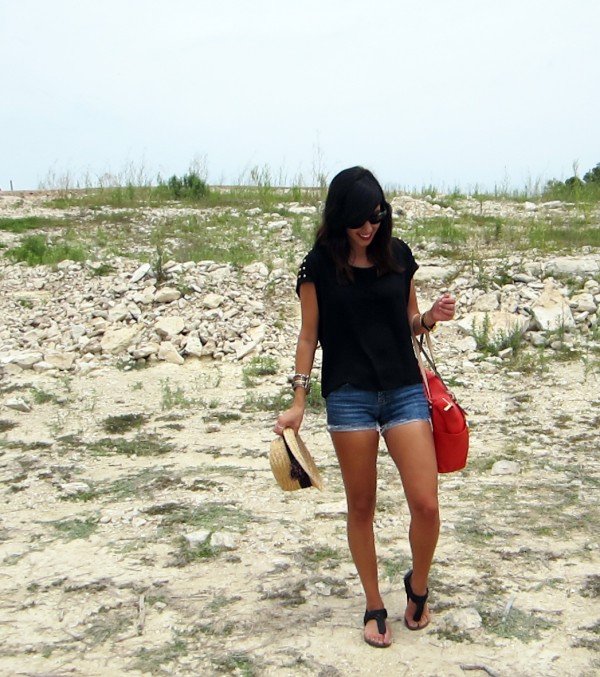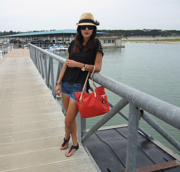 Nothing like a beautiful lake scene to inspire a photo shoot! The shirt in this laid back summer outfit is from Marshalls.  I love this shirt because of the studs and the open back.  The shorts I found on sale from Nordstrom Rack last summer.  The black trimmed fedora hat is from Aldo. My snake bracelet is from the Bauble Bar and my gold ball end cuff bracelet is from Charming Charlie. The black braided sandals are Candie’s from Kohls. My tote is from Michael Kors. And of course I had to sneak in a picture of my awesome boyfriend.  Without him this whole website would not be possible.  Shout out to Fuerza Media!
