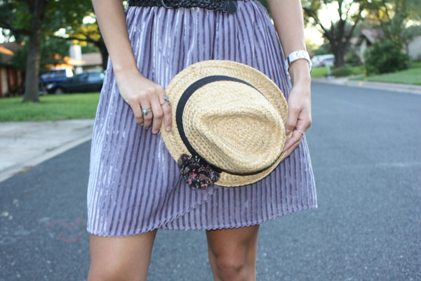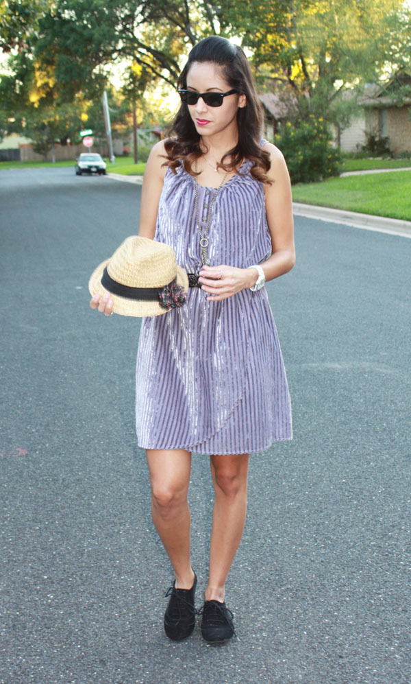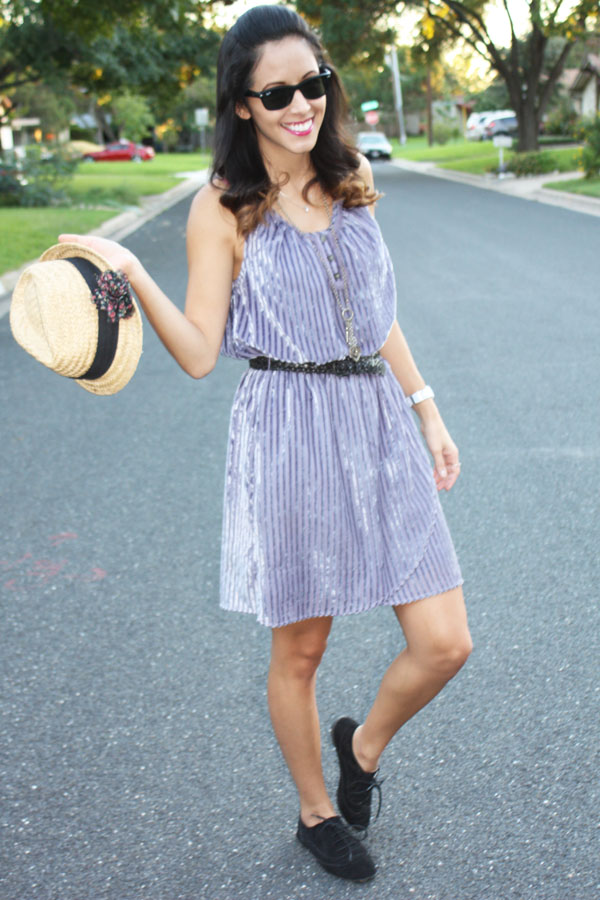 I love that this outfit is a little quirky.  It’s not every day you get to wear velvet, right?  This dress is from JcPenny and I paired it with these kicks from A’Gaci to keep the look comfortable and casual.  My fedora hat is from Aldo.  These classic wayfarer sunnies are RayBan.